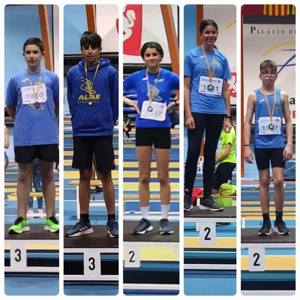 El botin final fue de cinco medallas para los nuestros repartidas en tres platas y dos bronces. Las platas fueron para Iris Mingarro en Triple salto con 9,11mts; Aaron Escanero en salto de Altura con 1,36mts y Julia Bertrand en lanzamiento de Peso con 7,75mts. Cabe destacar que estos tres atletas rozaron el oro y son de primer año , con lo que a buen seguro seguirán dando muchas alegrías en la categoría. Los bronces fueron para Jorge Dueso en Triple salto con 9,72mts y Adrian Villalba en lanzamiento de Peso con 8,99mts.