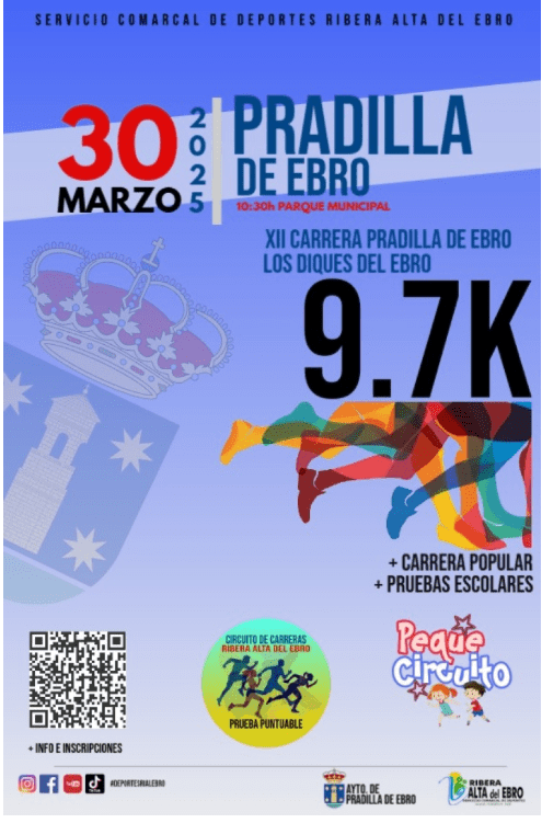 El Domingo 30 de Marzo se celebra la XII Carrera Popular de Pradilla de Ebro, localidad cercana a Zaragoza y prueba en la que participamos todos los años. Os paso el reglamento en pdf con horarios, circuitos y distancias, muy asequibles para todas las categorías.